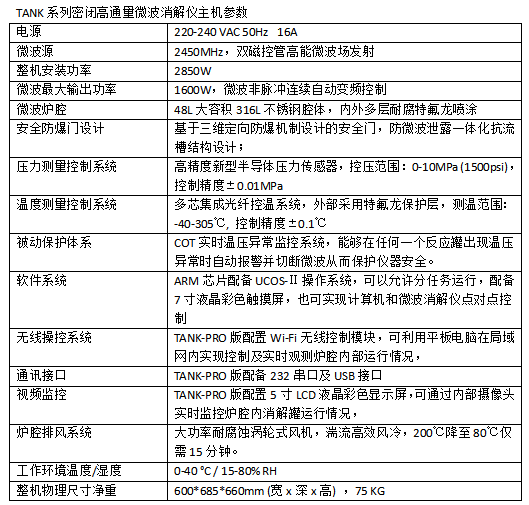 TANK使用ARM芯片配備UCOS-Ⅱ操作系統(tǒng),運行穩(wěn)定可靠。采用7寸液晶彩色觸摸屏,觸控操作流暢簡便。頁面實時顯示工作狀態(tài)及溫壓變化曲線。內(nèi)置專家方法庫,也可自行編輯及存儲用戶方法。內(nèi)置COT實時溫壓異常監(jiān)控系統(tǒng)能夠在任何一個反應罐出現(xiàn)溫壓異常時自動報警并切斷微波從而保護儀器安全。PRO版獨有Wi-Fi無線控制模塊,既可實現(xiàn)計算機和微波消解儀點對點的控制,也可利用平板電腦等在局域網(wǎng)內(nèi)實現(xiàn)控制及實時觀測,使用戶“舒心實驗、安全實驗”。PRO版亦采用雙屏設計,另配5寸LCD液晶彩色顯示屏通過內(nèi)部攝像頭實時監(jiān)控爐腔內(nèi)消解罐運行情況。